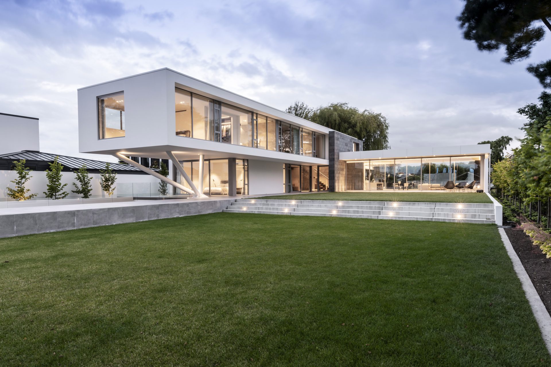 The contemporary sculpture has a tongue and cheek reference to a childhood ‘James Bond style 007’ home. The main influence in the design is the essence of simplicity, its composition, and purity of form. While the home has a definite geometric elegance to the design, there is a hidden playfulness to be found within the structural intricacies. The expansive cantilevered master suite wing is dramatically supported by three dynamic deftly placed prongs; further tying into the underlying alter ego of the design.