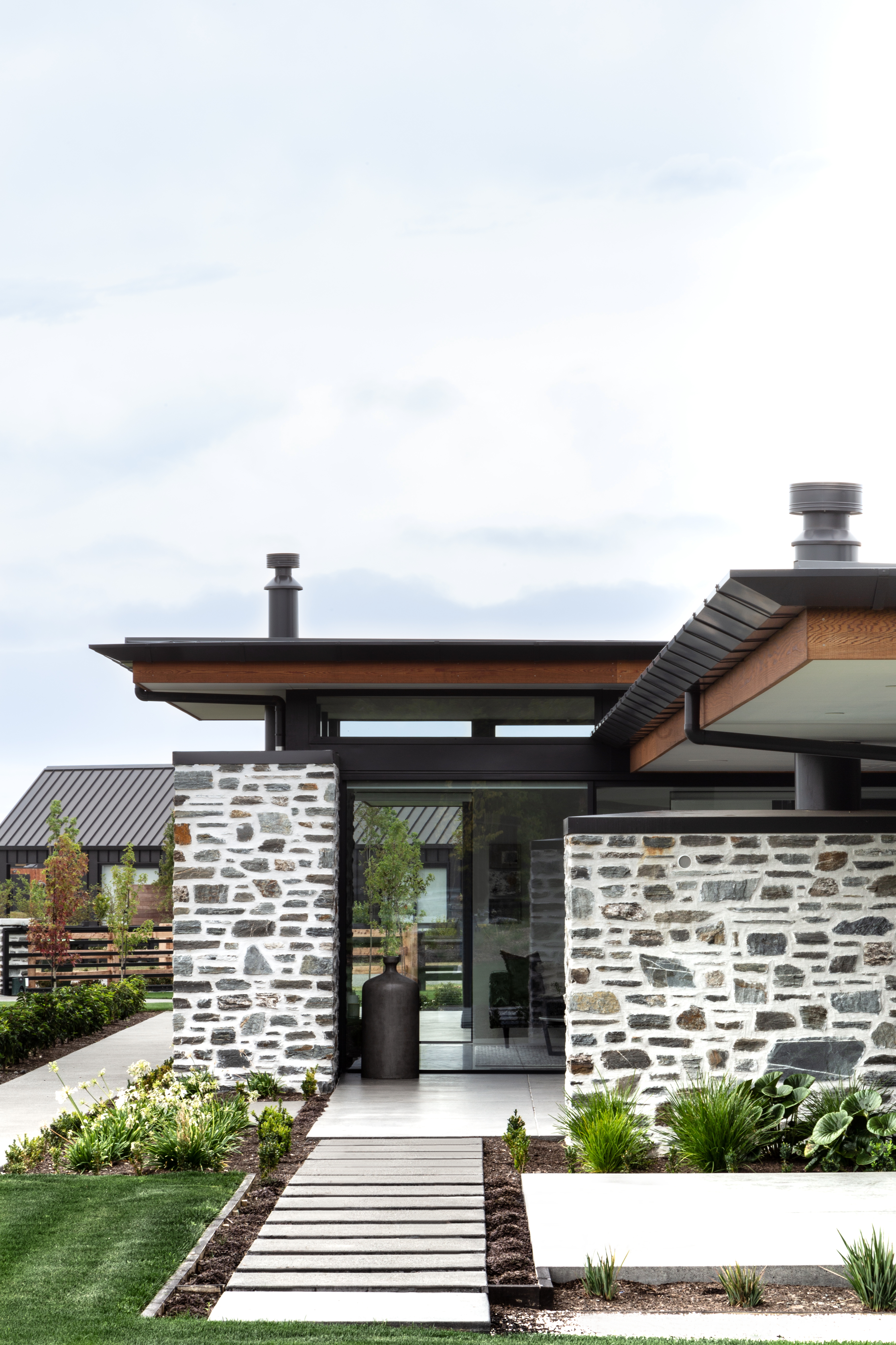 The semi-rural landscape allowed for a spread-out, low and linear design, while the natural and rugged bagged stone brings a weight to the house, anchoring it to the land.